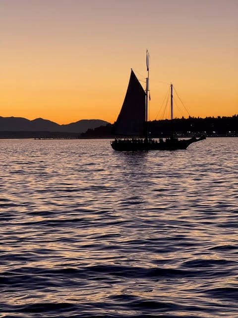 And it was wild, y’all! A huge suite overlooking First st and the Pikes Place Market with a view of the water. There was a sitting area, a fully stocked bar with snacks. It was absolutely amazing! We hurried downstairs, crossed a busy intersection at First st, then hopped on a boat for our sunset sail on Elliot Bay.
